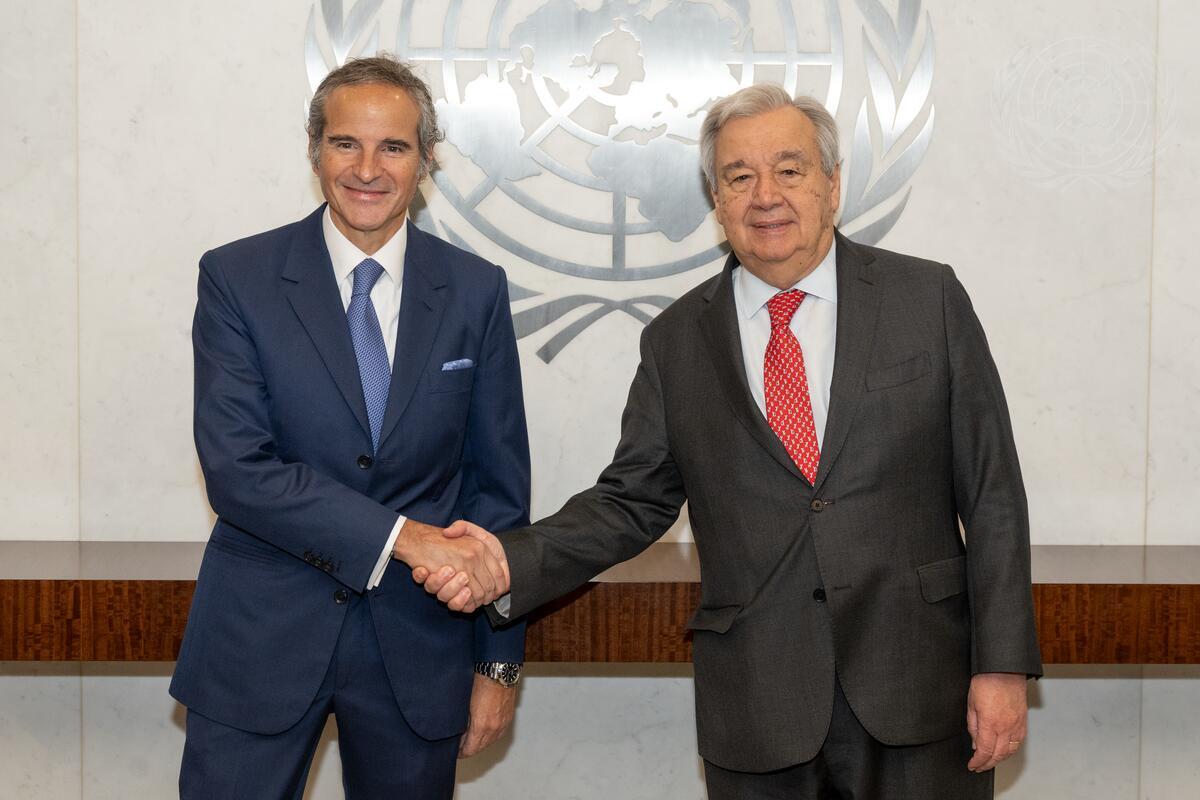 Secretary-General António Guterres (right) meets with Rafael Mariano Grossi, Director-General of International Atomic Energy Agency.