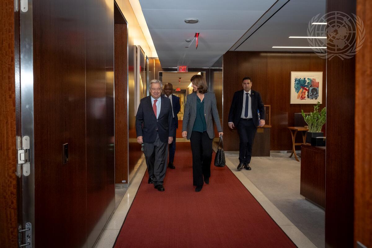 Secretary-General António Guterres (left) meets with María Angela Holguín Cuéllar, Personal Envoy of the Secretary-General on Cyprus.