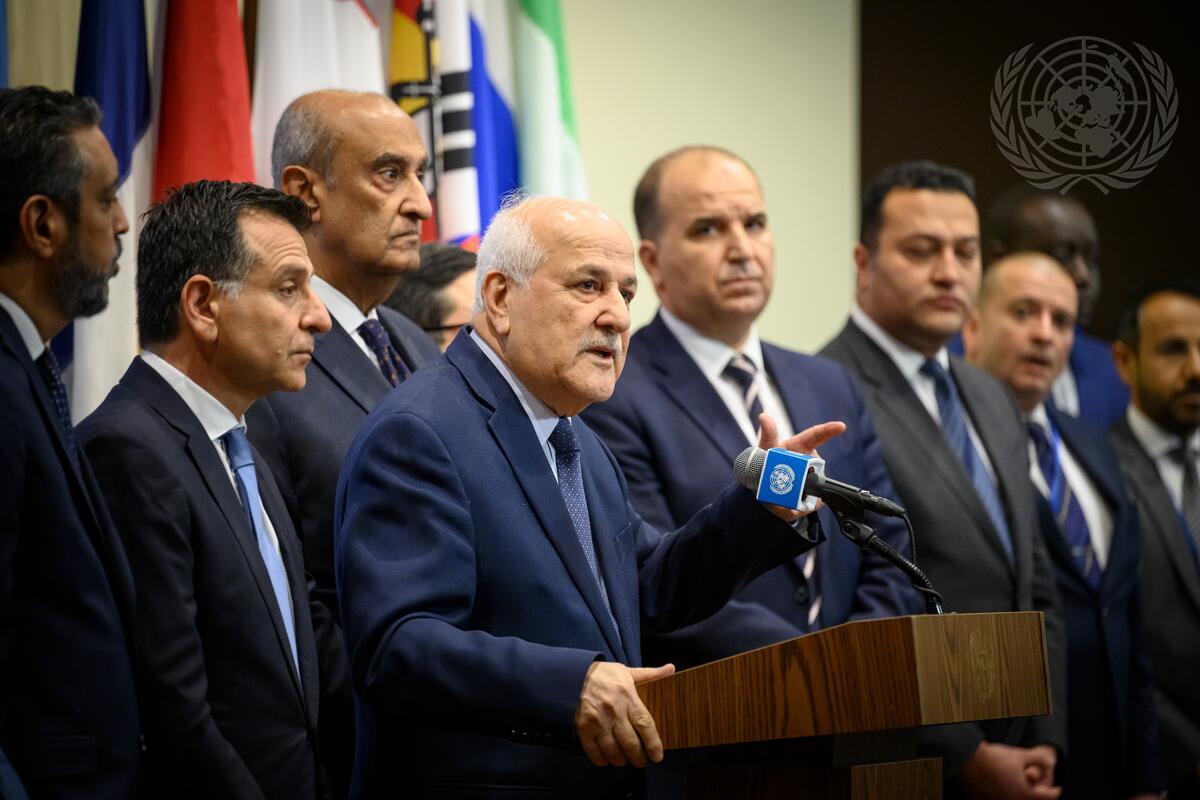 Riyad Mansour (at microphone), Permanent Observer of the State of Palestine to the United Nations, briefs reporters on recent developments related to Gaza. With him are Permanent Representatives of the Arab Group.