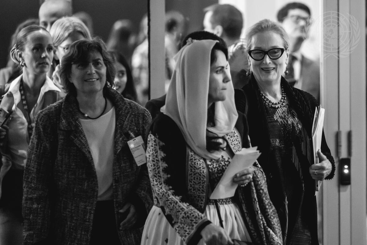 Fawziya Koofi (centre), former Deputy Speaker of Parliament in Afghanistan, and Meryl Streep (right), actor, walk to a press conference following the "The Inclusion of Women in the Future of Afghanistan" meeting. The meeting was about the situation of women in Afghanistan after a series of laws were enacted that formalized the systematic erasure of women and girls from public life.
