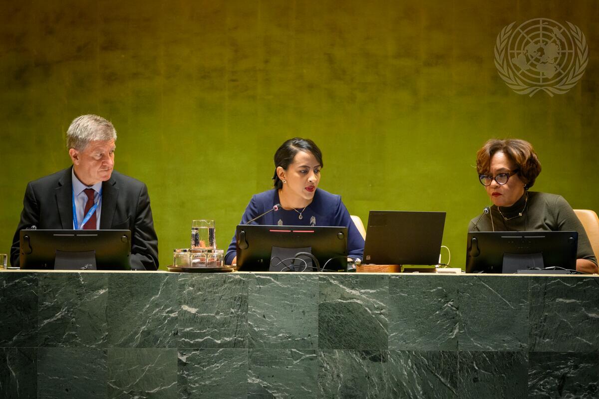Rafaravavitafika Rasata (centre) Vice-President of the seventy-ninth session of the United Nations General Assembly and Minister of Foreign Affairs of the Republic of Madagascar, chairs the Summit of the Future. At left is Guy Ryder, Under Secretary-General for Policy and UN lead for the Summit of the Future, and at right is Ruth de Miranda, Director of the General Assembly and Economic and Social Council (ECOSOC) Affairs Division of the Department of General Assembly and Conference Management (DGACM).