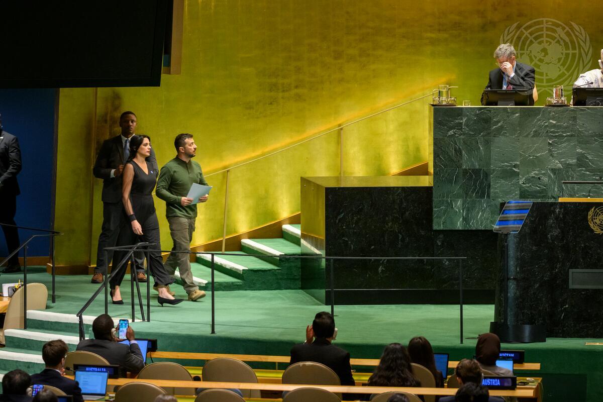 Volodymyr Zelenskyy (third from left), President of Ukraine, walks to the podium in the General Assembly Hall to address the Summit of the Future.