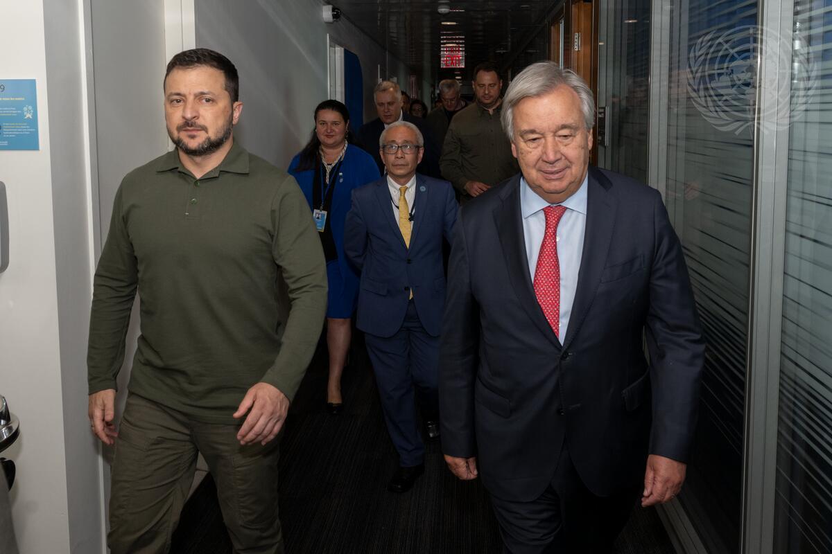 Secretary-General António Guterres (right) meets with Volodymyr Zelenskyy (left), President of Ukraine.