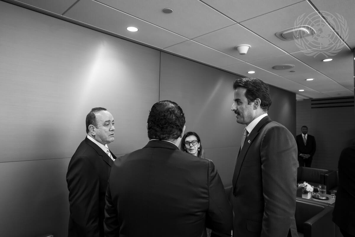 Sheikh Tamim bin Hamad Al Thani (right), Amir of the State of Qatar, speaks with Alejandro Giammattei Falla (left), President of the Republic of Guatemala, and others ahead of addressing the general debate of the General Assembly’s seventy-eighth session.