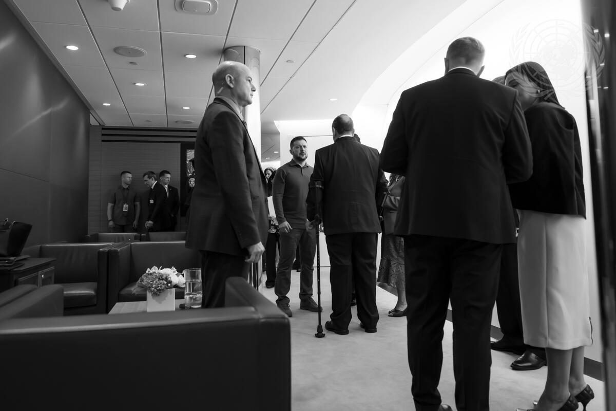 Volodymyr Zelenskyy (centre), President of Ukraine, before speaking at the opening of seventy-eighth session of the General Assembly Debate on the theme “Rebuilding trust and reigniting global solidarity: accelerating action on the 2030 Agenda and its Sustainable Development Goals towards peace, prosperity, progress and sustainability for all.”