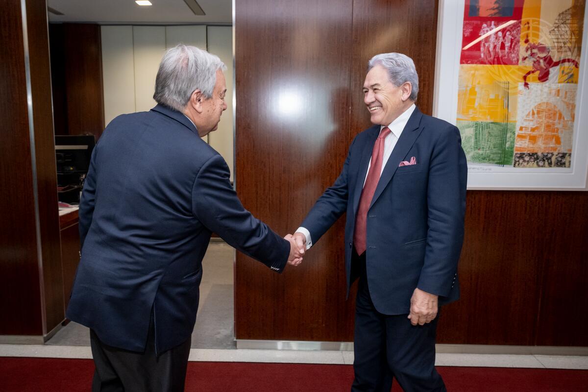 Secretary-General António Guterres (left) meets with Winston Peters, Deputy Prime Minister and Minister for Foreign Affairs of New Zealand.