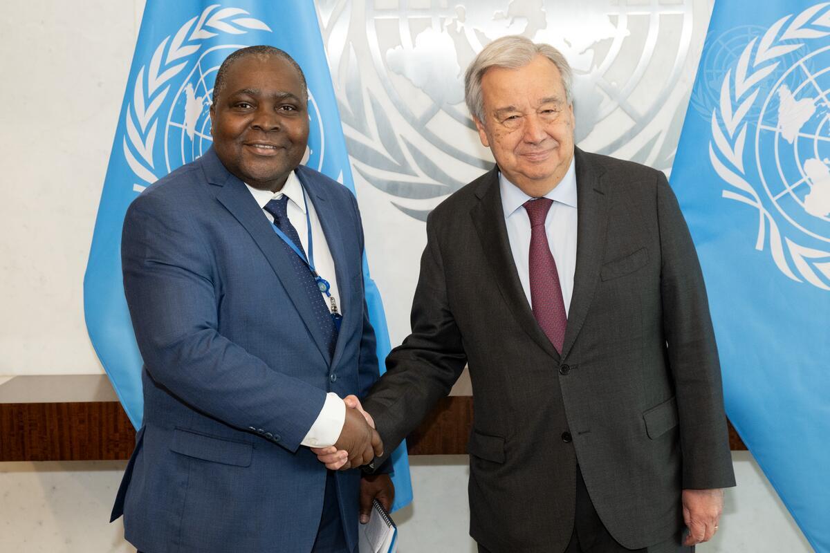 Michel Xavier Biang (left), Permanent Representative of Gabon to the United Nations, pays a farewell call on Secretary-General António Guterres.