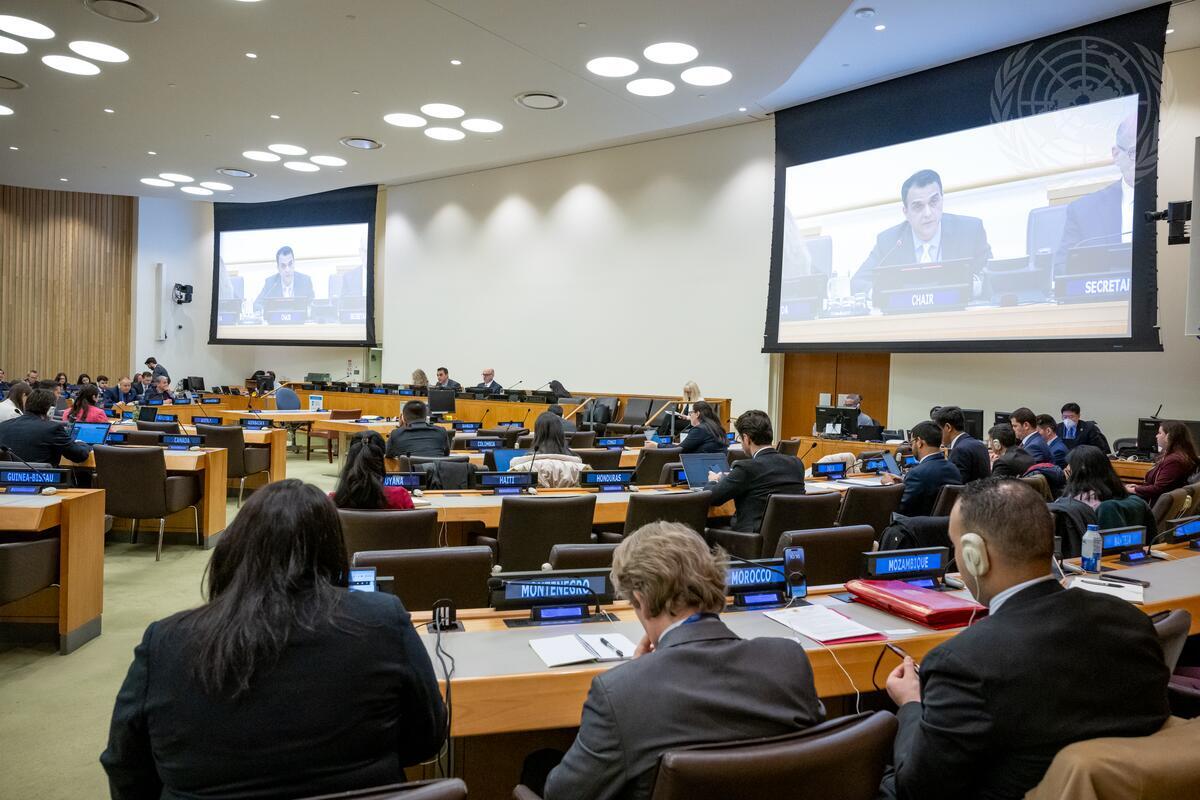 A wide view of the 390th plenary meeting of the Disarmament Commission Annual session. On the screen is Muhammad Usman Iqbal Jadoon, Deputy Permanent Representative of Pakistan to the United Nations.