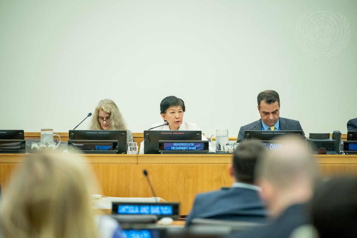 Izumi Nakamitsu (centre), High Representative for Disarmament Affairs, addresses the 390th plenary meeting of the Disarmament Commission Annual session.