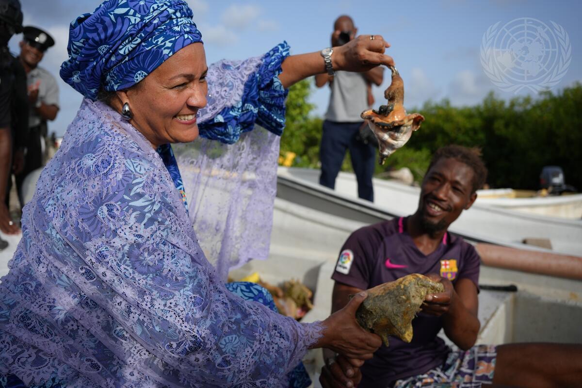 Deputy Secretary-General Amina Mohammed holds up a conch as she meets with fishermen that are part of an organized community called Fisherfolk Association in Antigua and Barbuda.