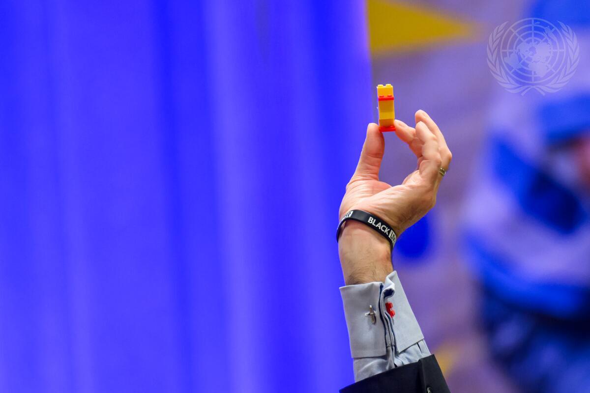A participant holds up the duck built with LEGO bricks during the panel discussion on the International Day of Play (11th June). Casper Aarlit Jensen, Senior Facilitation Manager at LEGO Foundation, asked participants to build a duck with the help of six pieces of LEGO bricks at the start of the panel discussion.