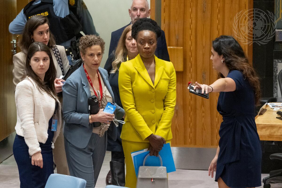 Danai Gurira (second from right), UN Women Goodwill Ambassador, arrives in the Security Council Chamber to brief the Security Council meeting on women and peace and security, with a focus on preventing conflict-related sexual violence through demilitarization and gender-responsive arms control. The Council heard a report of the Secretary-General on conflict-related sexual violence.