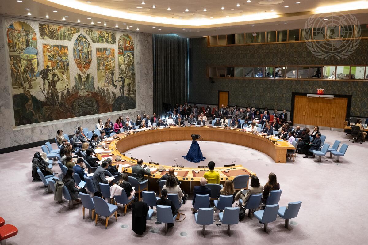 A wide view of the Security Council meeting on women and peace and security, with a focus on preventing conflict-related sexual violence through demilitarization and gender-responsive arms control. The Council heard a report of the Secretary-General on conflict-related sexual violence.