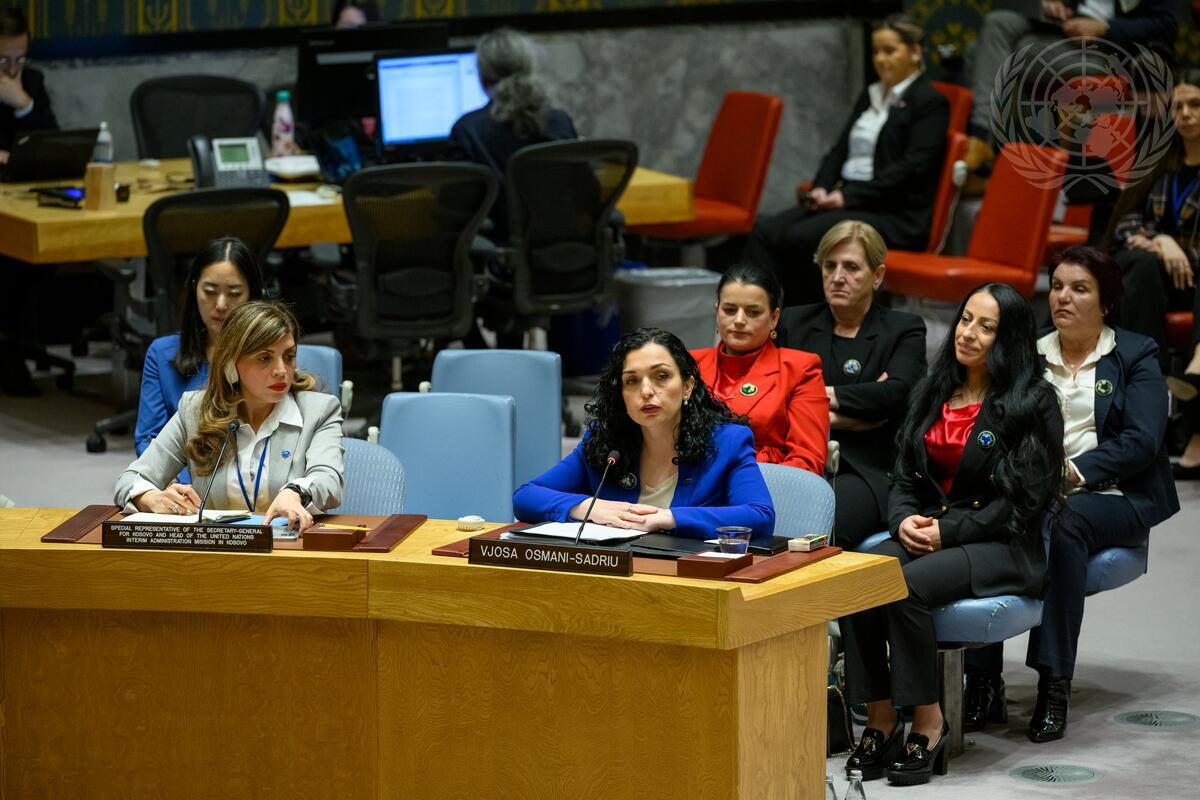 Vjosa Osmani-Sadriu (right at table) addresses the Security Council meeting.