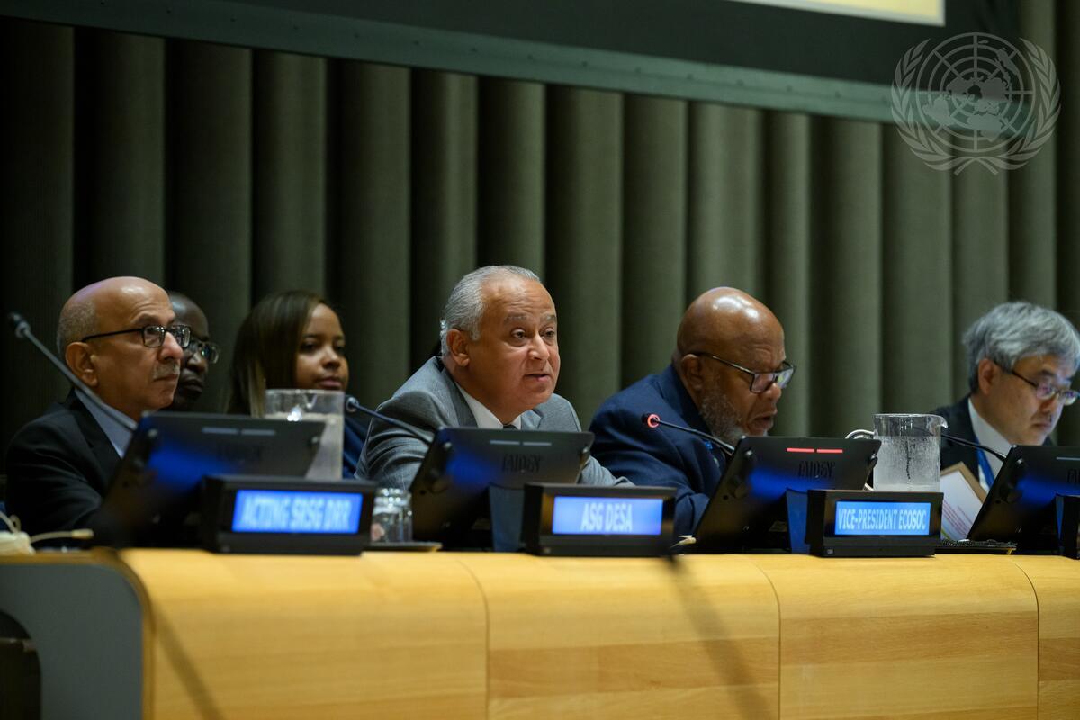 Tarek Ladeb (centre left at table), Vice President of the Economic and Social Council (ECOSOC) and Permanent Representative of Tunisia to the United Nations, addresses the joint event of General Assembly and Economic and Social Council on the theme “El Niño 2023-2024: Actions for the safety, sustainability and resilience of people and the planet".