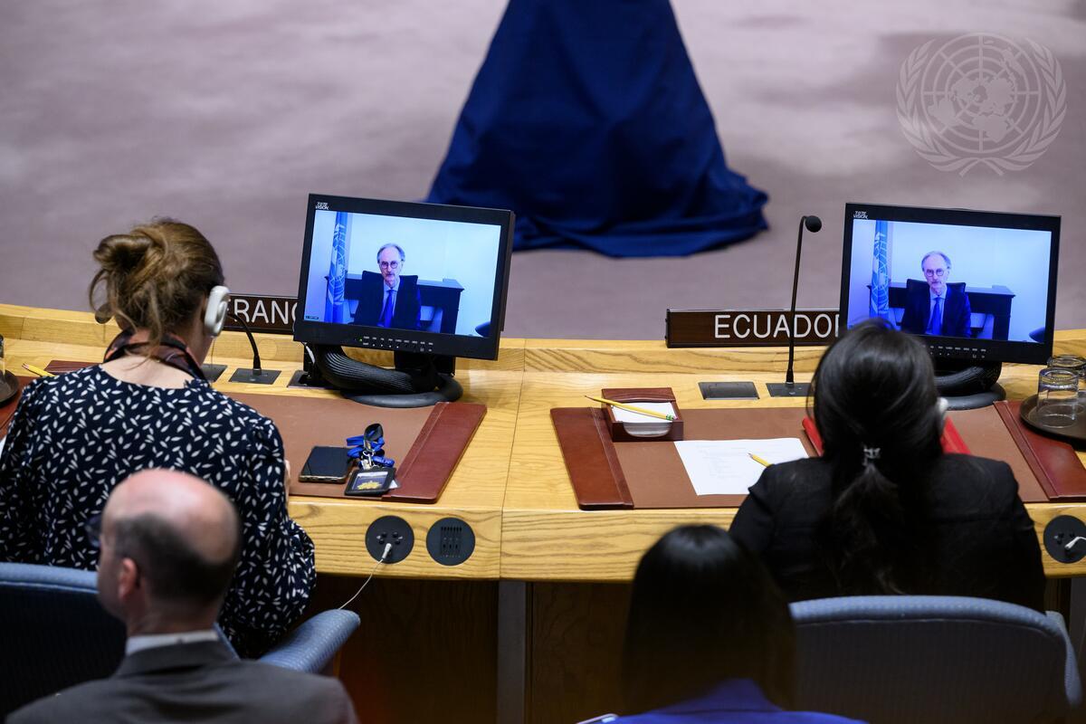 Geir Pedersen (on screens), Special Envoy of the Secretary-General for Syria, briefs the Security Council meeting on the situation in the Middle East (Syria).