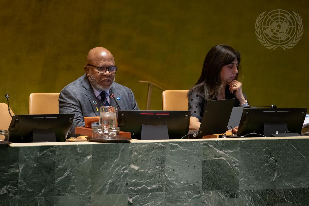 Dennis Francis (left), President of the seventy-eighth session of the General Assembly, chairs the 72nd plenary meeting of the General Assembly.