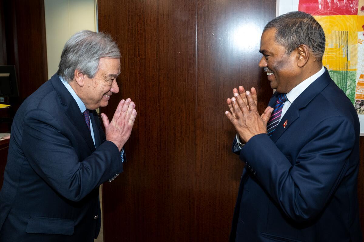 Secretary-General António Guterres (left) meets with Upendra Yadav, Deputy Prime Minister and Minister of Health and Population of Nepal.