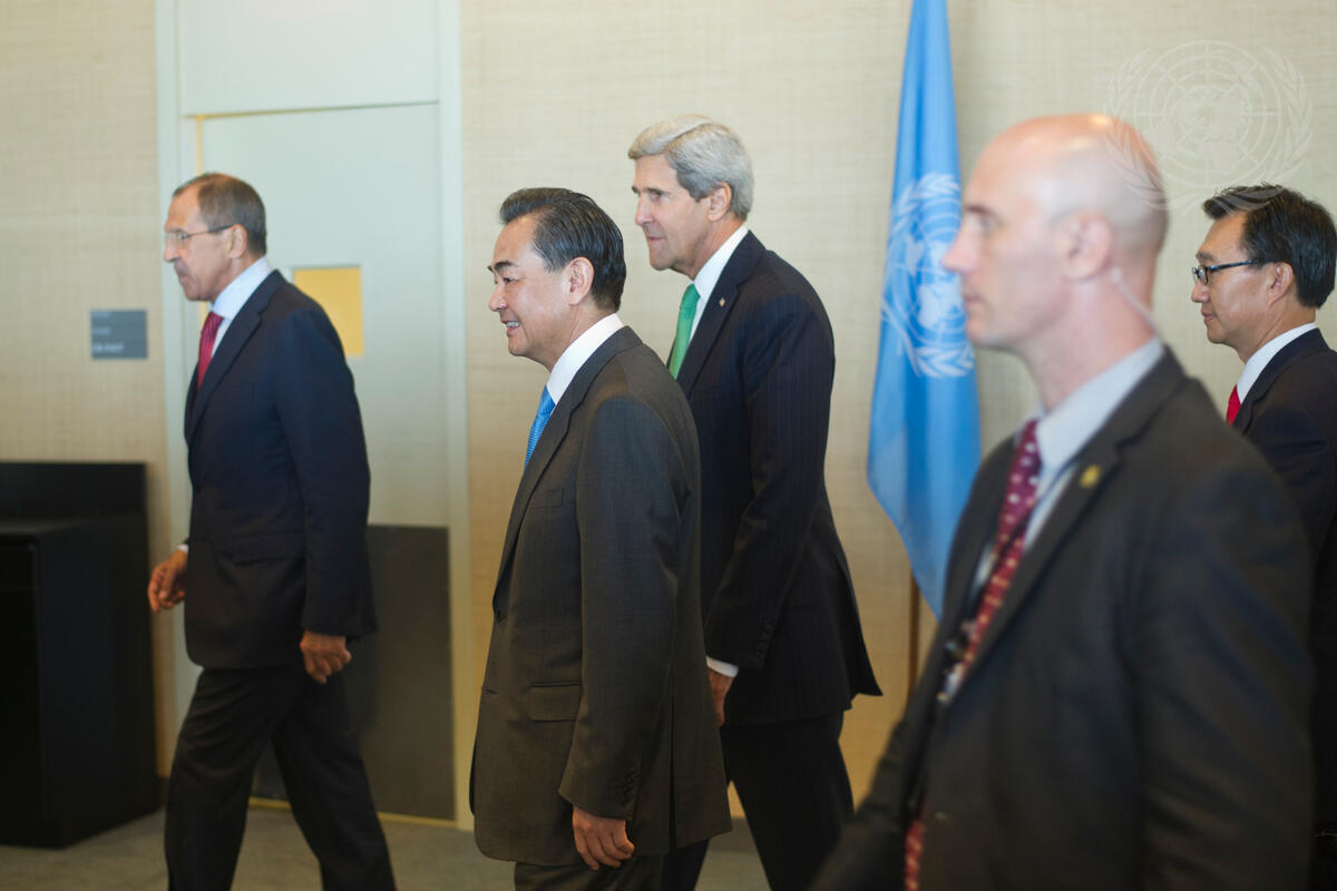 Three of the Ministers arriving for the luncheon (from left): Sergey V. Lavrov, Minister for Foreign Affairs of the Russian Federation; Wang Yi, Minister for Foreign Affairs of the People’s Republic of China; and John F. Kerry, Secretary of State of the United States.