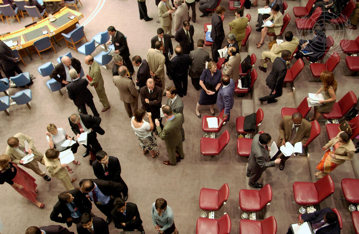 Members of the Security Council in discussions before the formal meeting on a resolution concerning Iraq.