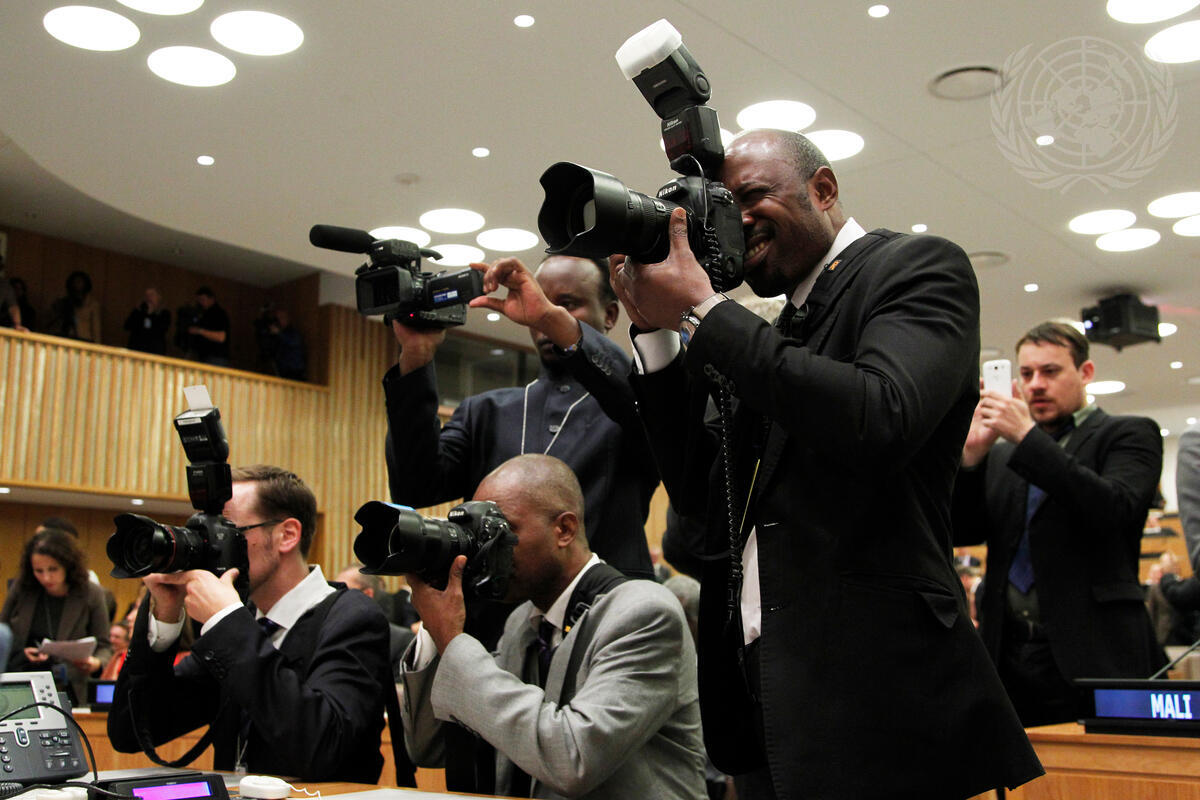 A behind the scenes shot of international photojournalists covering the High-Level Panel on Poaching and Illicit Wildlife Trafficking during the opening weeks of the sixty-eighth session of the General Assembly. The event was co-organized by the Permanent Missions of Gabon and Germany.