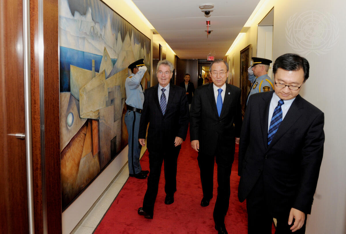 Secretary-General Ban Ki-moon (centre right) meets with Heinz Fischer (centre left), President of Austria. At right is Yoon Yeocheol, UN Chief of Protocol.
