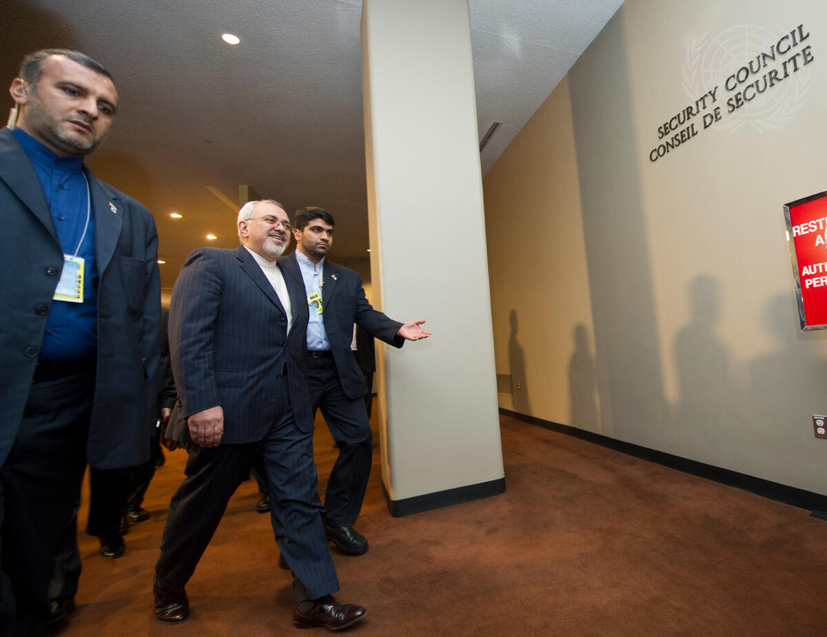 Javad Zarif (centre), Minister for Foreign Affairs of the Islamic Republic of Iran, arrives at the Security Council consultations room for a meeting with the Council’s five permanent members – China, France, Russia, the United States and the United Kingdom – and Germany.