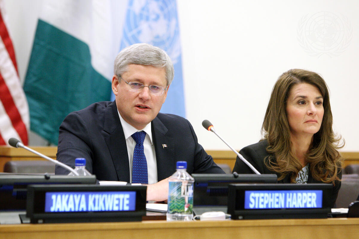 Stephen Harper (left), Prime Minister of Canada, speaks at a special event on “Women’s and Children’s Health: The Unfinished Agenda of the Millennium Development Goals (MDGs)”. On right is Melinda Gates, Co-Chair of the Bill & Melinda Gates Foundation.