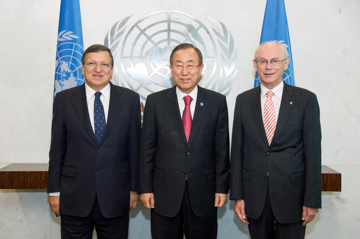 Secretary-General Ban Ki-moon (centre) meets with José Manuel Barroso (left), President of the European Commission, and Herman Van Rompuy, President of the European Council.