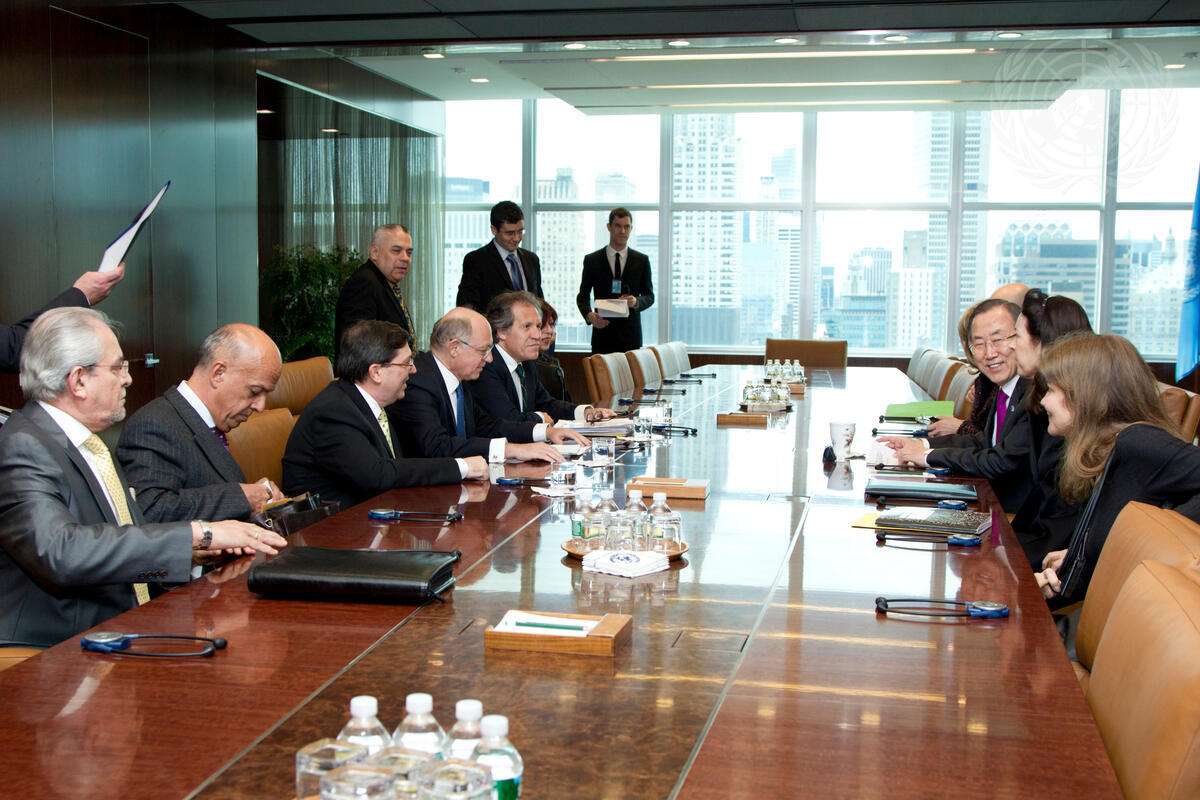 Secretary-General Ban Ki-moon (third from right) meets with (starting second from left at table, moving up) Jose Beraún, Deputy Minister for Foreign Affairs of Peru; Bruno Rodríguez Parrilla, Minister for Foreign Affairs of Cuba; Héctor Marcos Timerman, Minister for Foreign Affairs of Argentina; and Luis Almagro, Minister for Foreign Affairs of Uruguay.