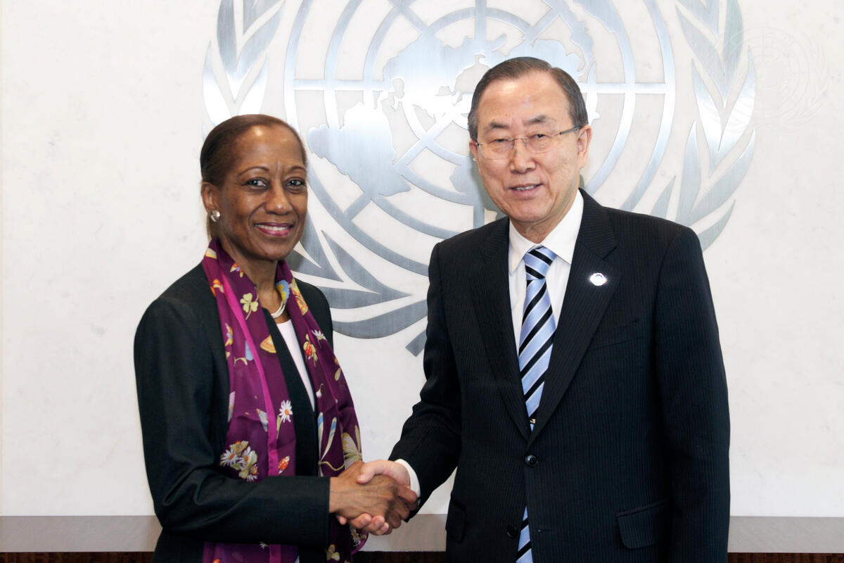 Paulette Bethel (left), Permanent Representative of the Bahamas to the United Nations, pays a farewell call on Secretary-General Ban Ki-moon.