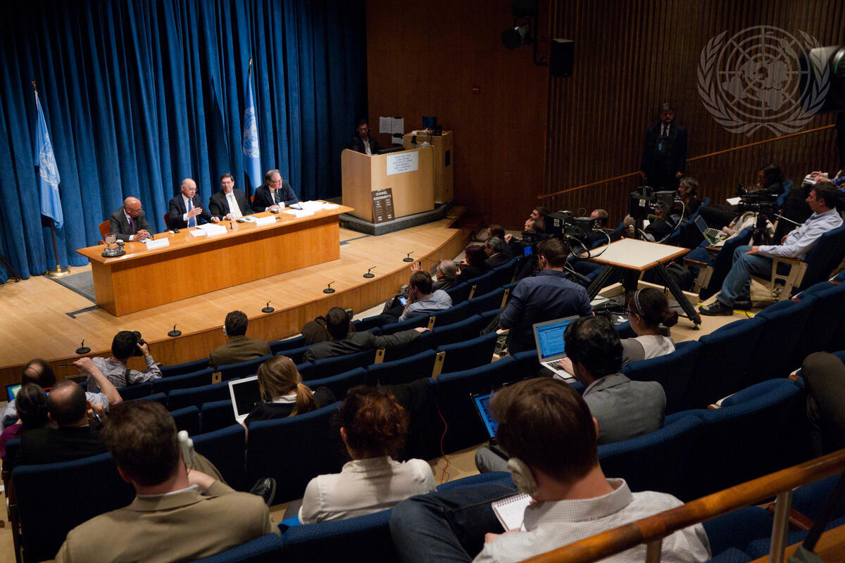 A view of the press briefing auditorium as Héctor Marcos Timerman (second from left on stage), Minister for Foreign Affairs of Argentina, speaks to journalists on the Falkland Islands (Malvinas). Also addressing the press conference were (from left on stage): Jose Beraún, Deputy Minister for Foreign Affairs of Peru; Bruno Rodríguez Parrilla, Minister for Foreign Affairs of Cuba; and Luis Almagro, Minister for Foreign Affairs of Uruguay.