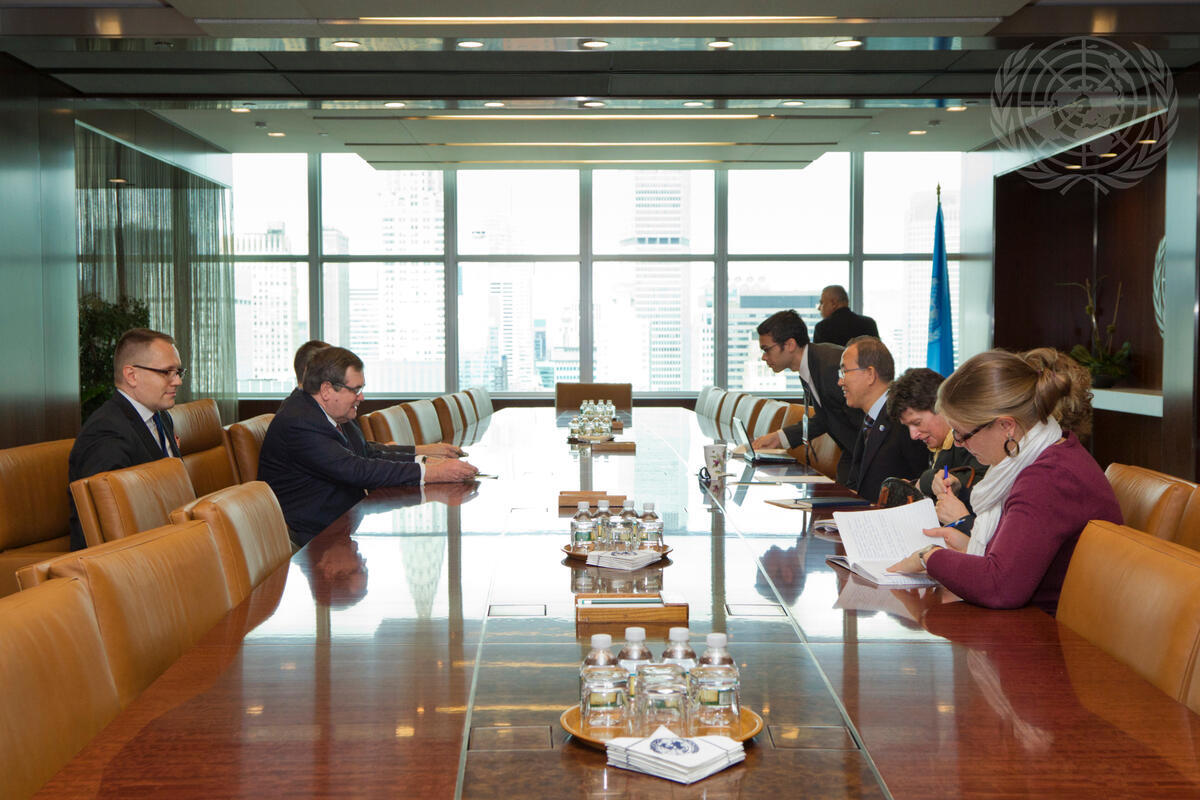Secretary-General Ban Ki-moon (centre right) meets with Jaakko Laajava (second from left), Under Secretary of State for Foreign and Security Policy of Finland and Facilitator for the 2012 Conference on the Establishment of a Middle East Zone Free of Nuclear Weapons and All Other Weapons of Mass Destruction (WMD).