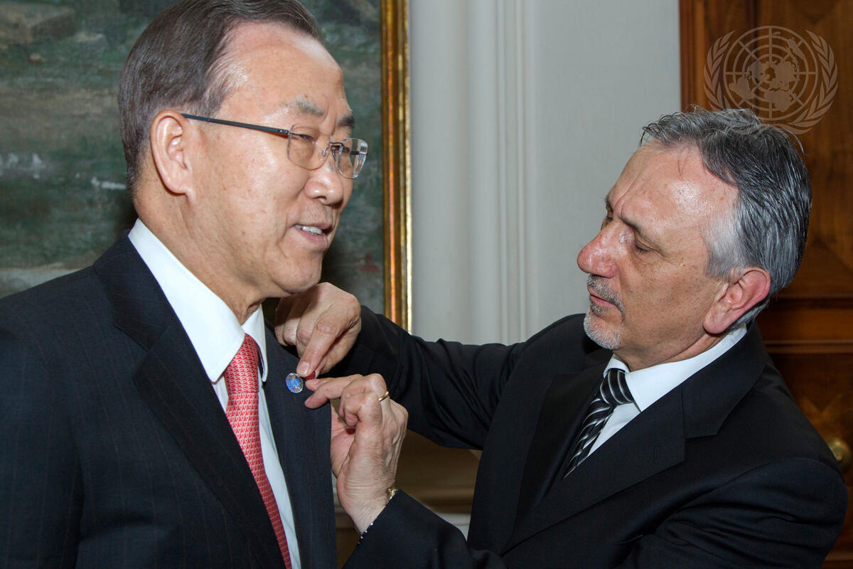 Secretary-General Ban Ki-moon (left) receives the Honour of the Knight of Grand Cross of the Equestrian Order of Saint Agatha from Pasquale Valentini, Minister of Foreign Affairs of San Marino.