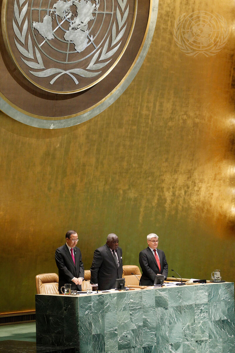 Secretary-General Ban Ki-moon (left); Leslie Kojo Christian, Permanent Representative of Ghana to the UN and Vice-President of the General Assembly (centre); and Ion Botnaru, Director of the General Assembly and Economic and Social Council (ECOSOC) Affairs Division; lead the General Assembly in observing a moment of silence for the late Zillur Rahman, who had served as the President of the People’s Republic of Bangladesh since 2009.