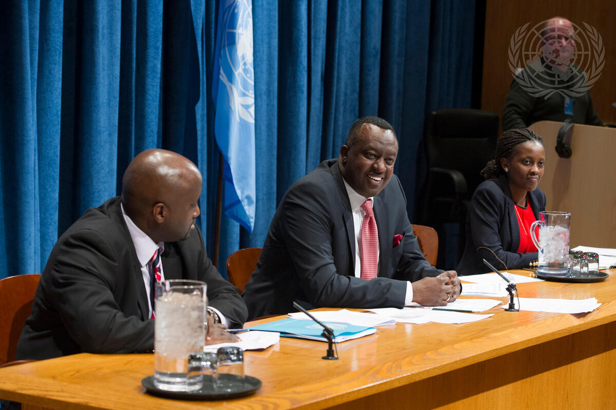 Eugène-Richard Gasana (centre), Permanent Representative of Rwanda to the United Nations and the President of the Security Council for the month of April, held a press conference today at UN Headquarters on the Council’s programme of work for the month.