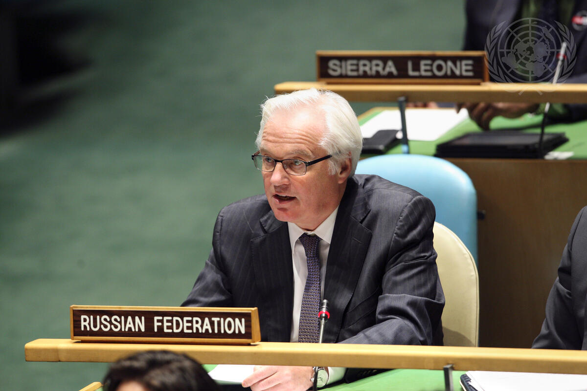 Vitaly I. Churkin, Permanent Representative of the Russian Federation to the United Nations, speaks from the floor of the Assembly before the vote.