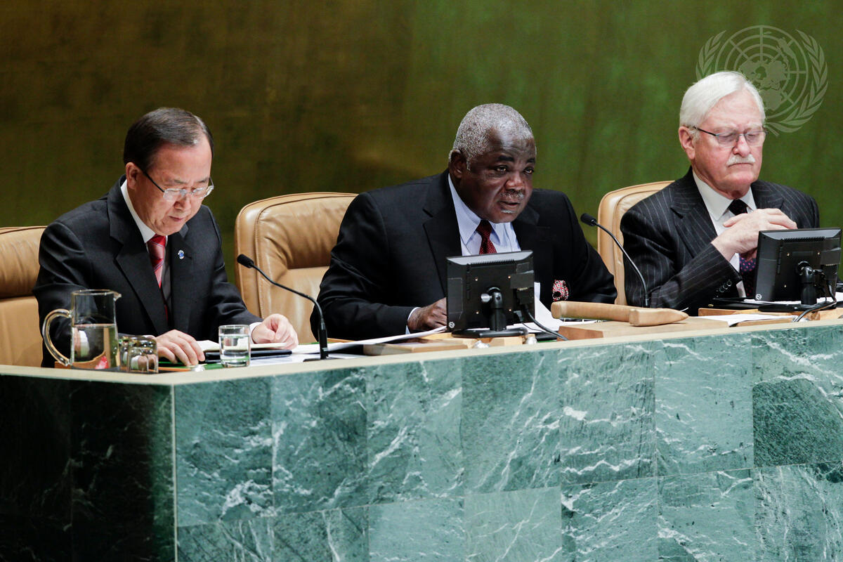 Leslie Kojo Christian (centre), Permanent Representative of Ghana to the UN and Vice-President of the General Assembly, addresses the Assembly’s commemorative meeting on the International Day of Remembrance of the Victims of Slavery and the Transatlantic Slave Trade (25 March). He is flanked by Secretary-General Ban Ki-moon (left) and Jean-Jacques Graisse, Acting Head of the Department for General Assembly and Conference Management.