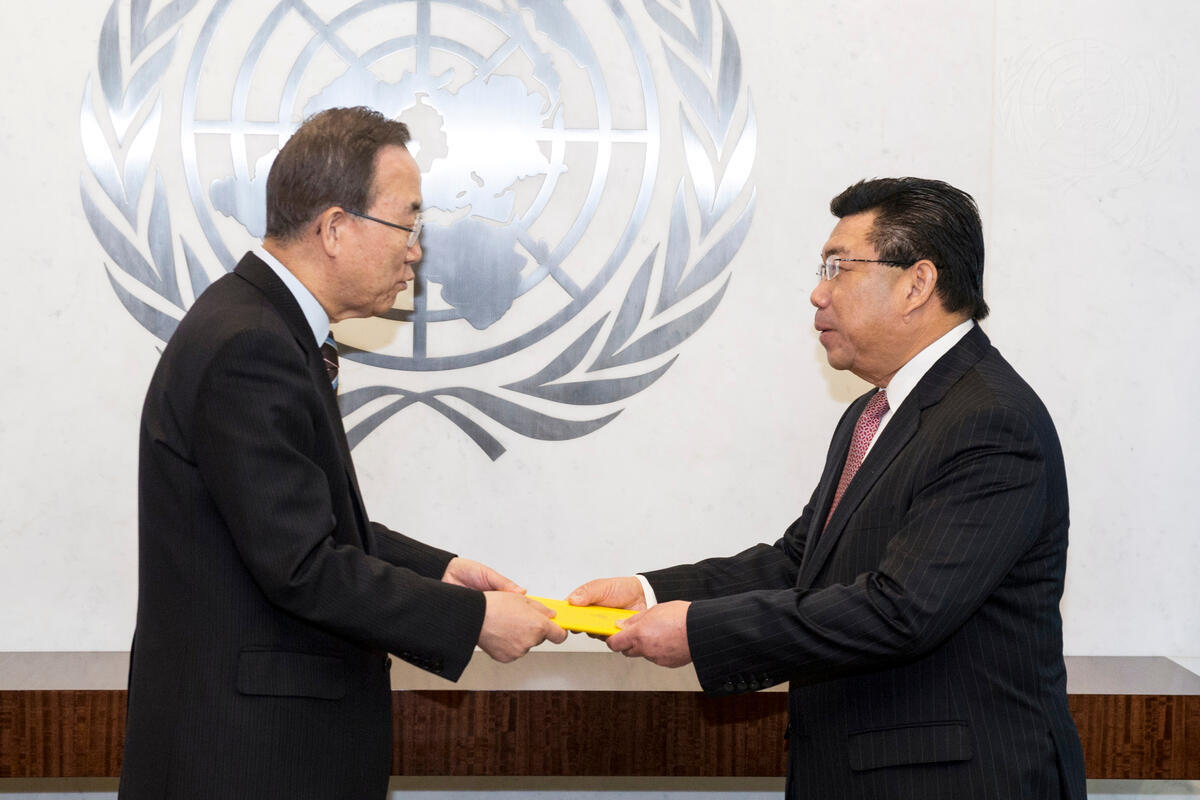 Dato Abdul Ghafar Ismail (right), new Permanent Representative of Brunei Darussalam to the United Nations, presents his credentials to Secretary-General Ban Ki-moon.