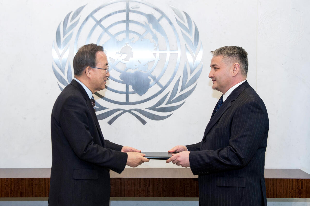 Dilyor Khakimov (right), new Permanent Representative of the Republic of Uzbekistan to the United Nations, presents his credentials to Secretary-General Ban Ki-moon.