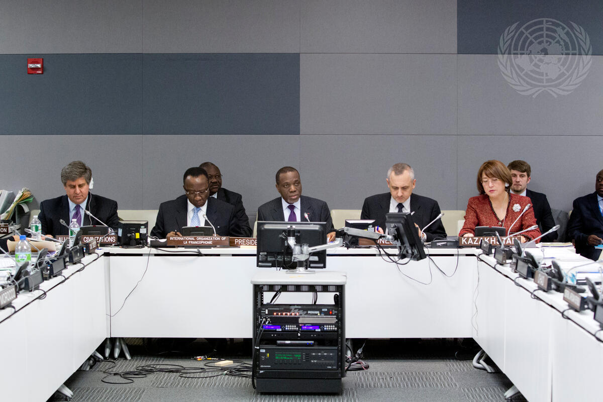 A view of the conference room as Nelson Messone (centre), Permanent Representative of the Gabonese Republic to the UN, addresses the event. He is flanked by Ousmane Paye (left), Special Adviser to OIF Secretary-General Abdou Diouf; and Philippe Kridelka, Director of the UNESCO Office in New York and Representative to the UN. At right (behind name plate) is Byrganym Aitimova, Permanent Representative of the Republic of Kazakhstan to the UN.