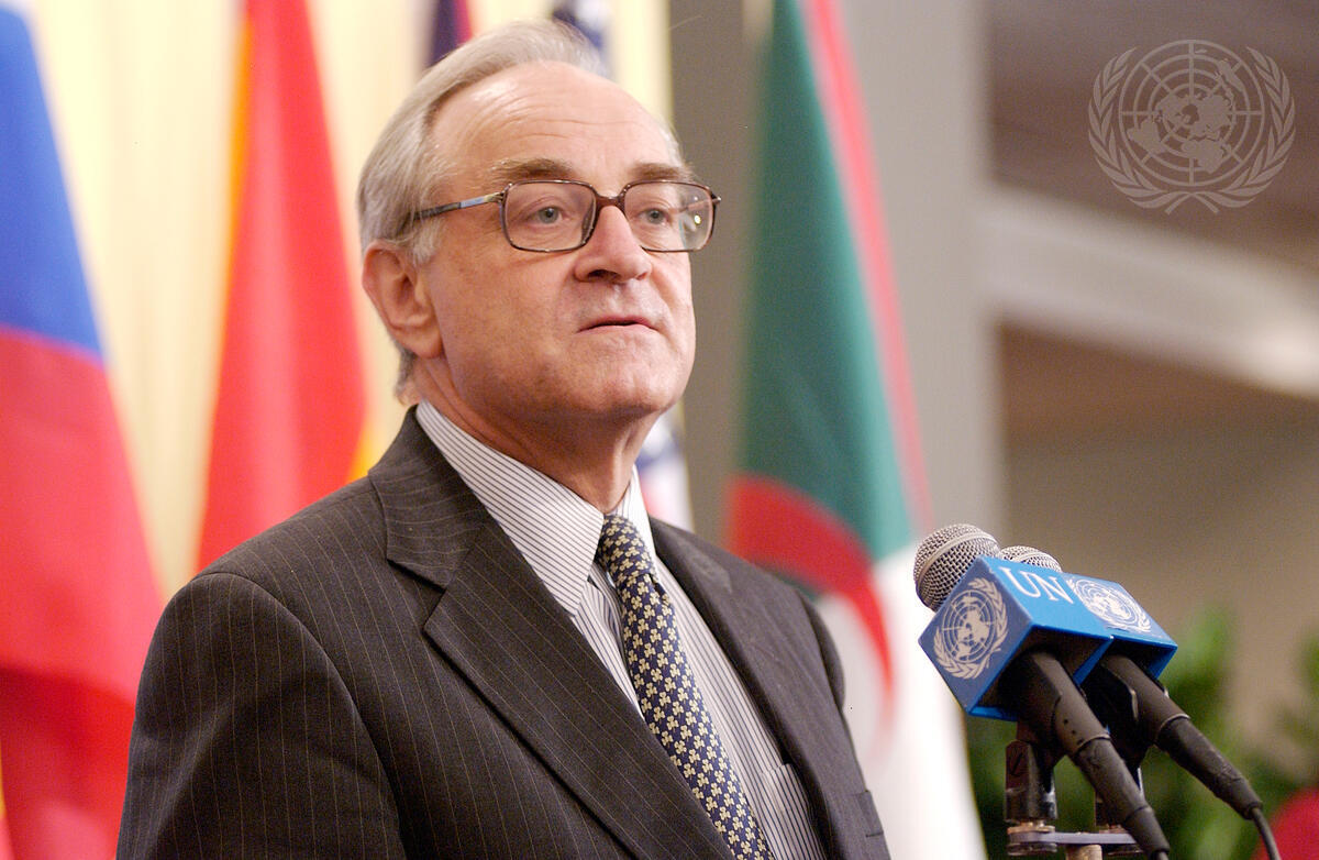 Ambassador Jean-Marc de La Sablière (France) addresses the press following a Security Council meeting on Iraq, where Members of the Council voted unanimously to adopt resolution 1546 (2004) on Iraq.