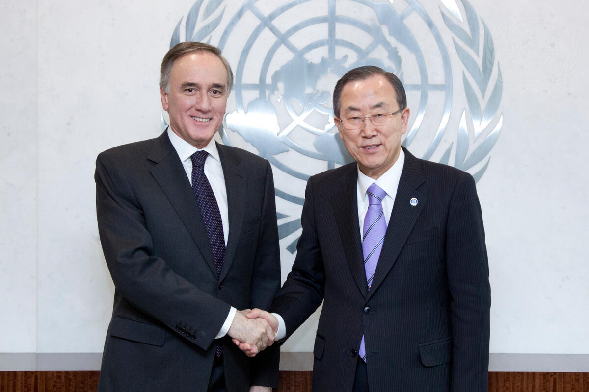Anastassis Mitsialis (left), Permanent Representative of Greece to the United Nations, pays a farewell call on Secretary-General Ban Ki-moon.