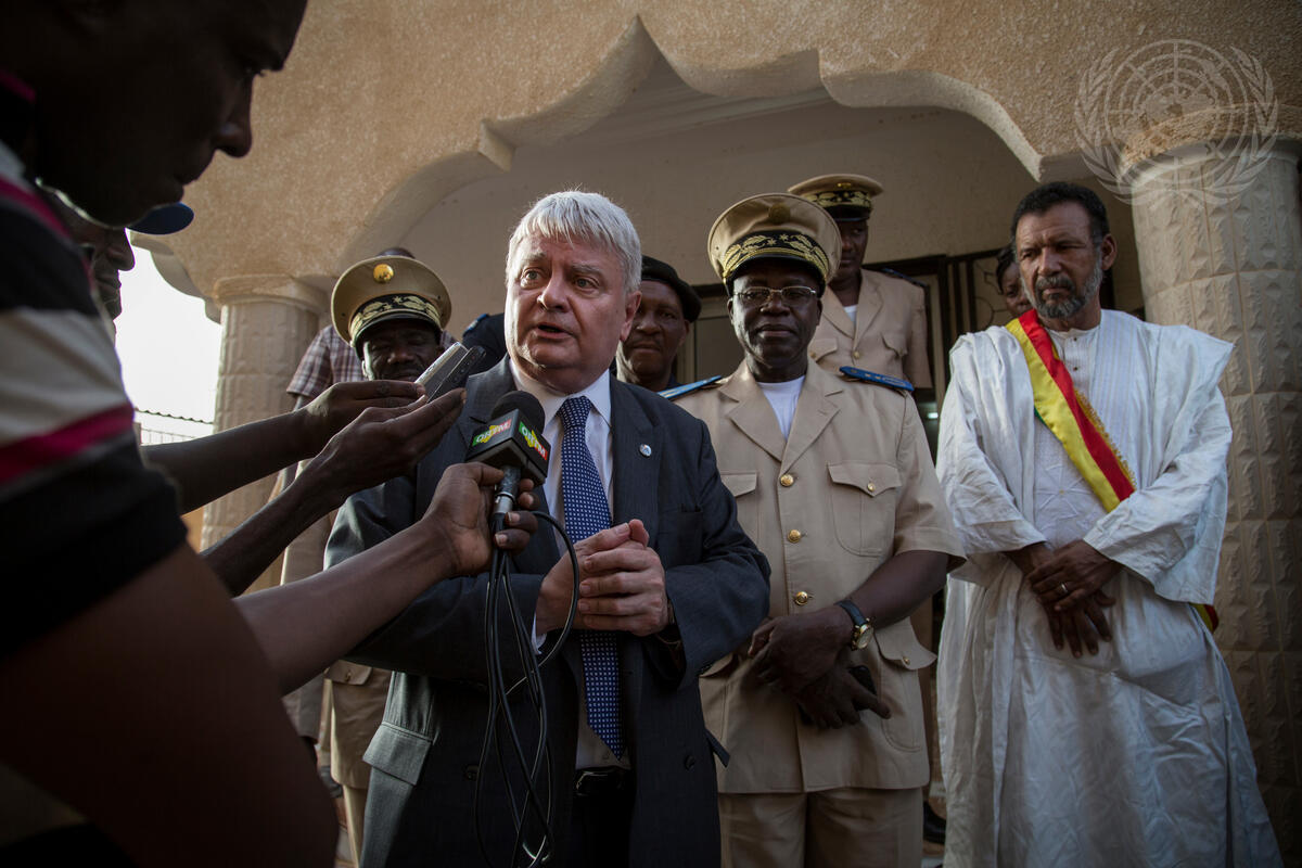 Under-Secretary-General for Peacekeeping Operations Hervé Ladsous (second from left) speaks to the local press after paying a visit to the Governor and local authorities in Gao, Mali.