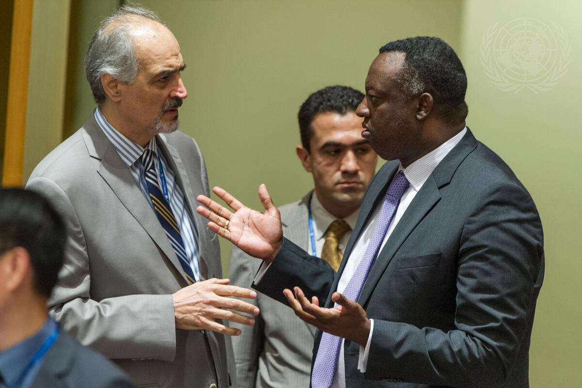 The Security Council unanimously adopted resolution 2165 (2014), which will allow the delivery of aid to people in need in Syria by the most direct routes. Bashar Ja’afari (left), Permanent Representative of the Syrian Arab Republic to the UN, speaks with Eugène-Richard Gasana, Permanent Representative of the Republic of Rwanda to the UN and President of the Security Council for July, at the Council’s meeting.