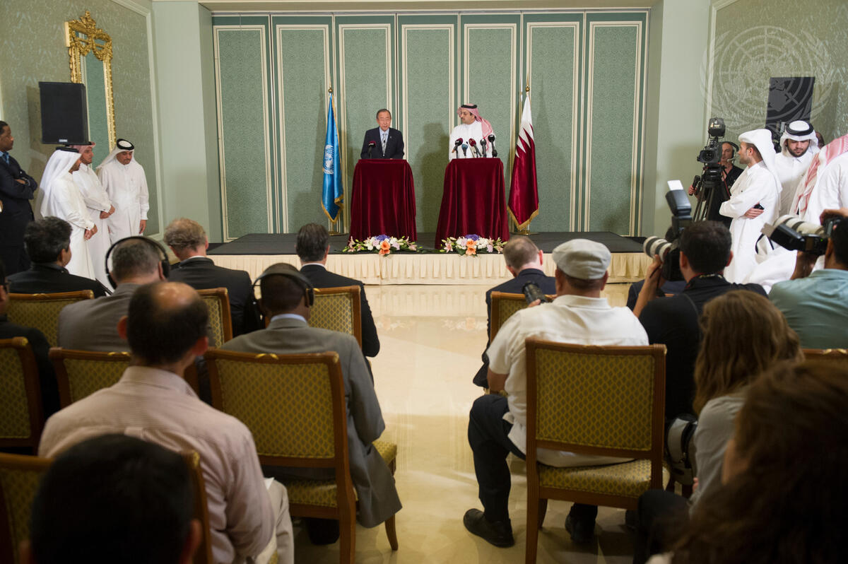 Secretary-General Ban Ki-moon (centre left) jointly addresses a press conference with Khalid Bin Mohamed Al-Attiyah (centre right), Minister for Foreign Affairs of the State of Qatar.