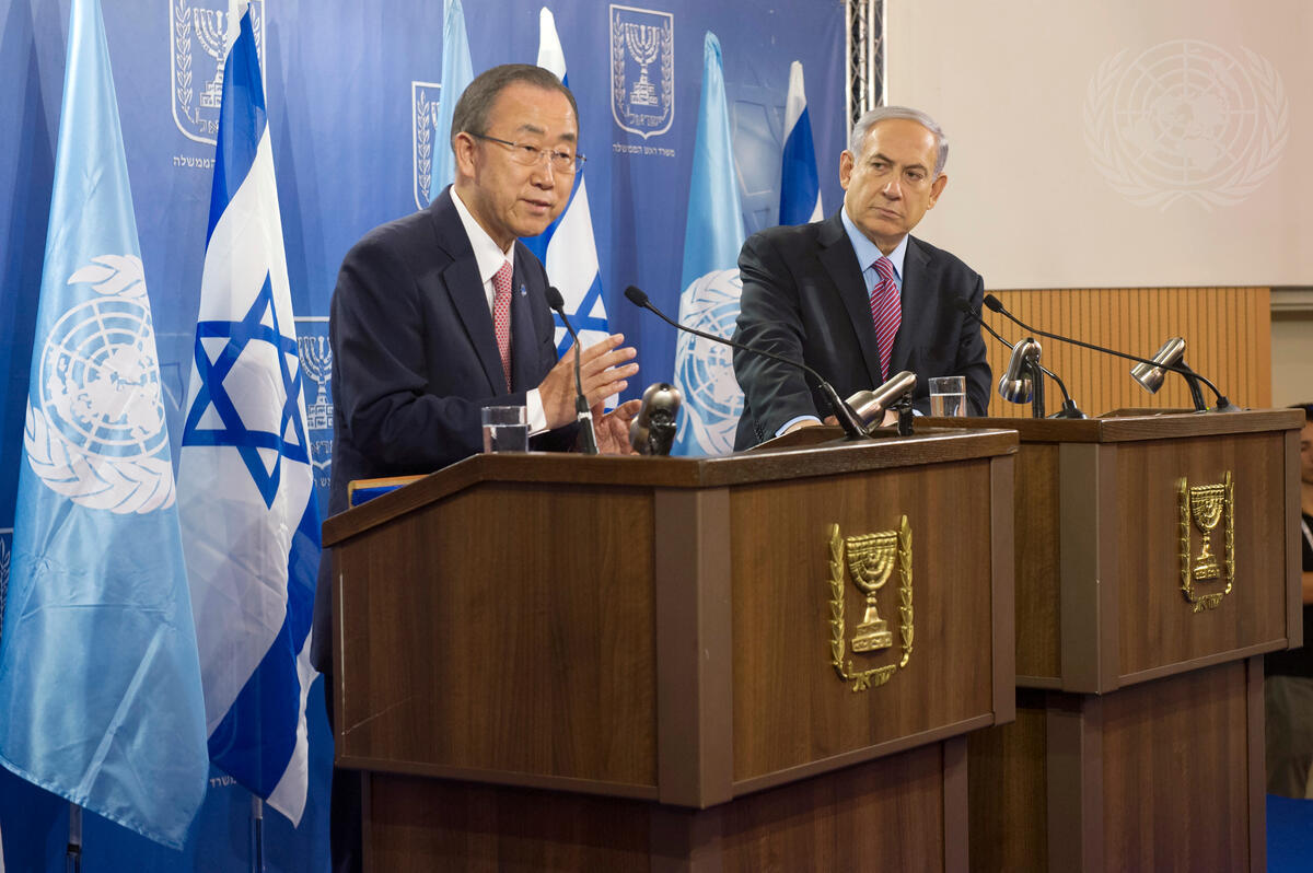 Secretary-General Ban Ki-moon (left) speaks to the press after his meeting with Israeli Prime Minister, Benjamin Netanyahu. Mr. Ban called on all parties to stop fighting and expressed his commitment to continue working for ""lasting peace and security, freedom and justice for all Israelis and Palestinians"".