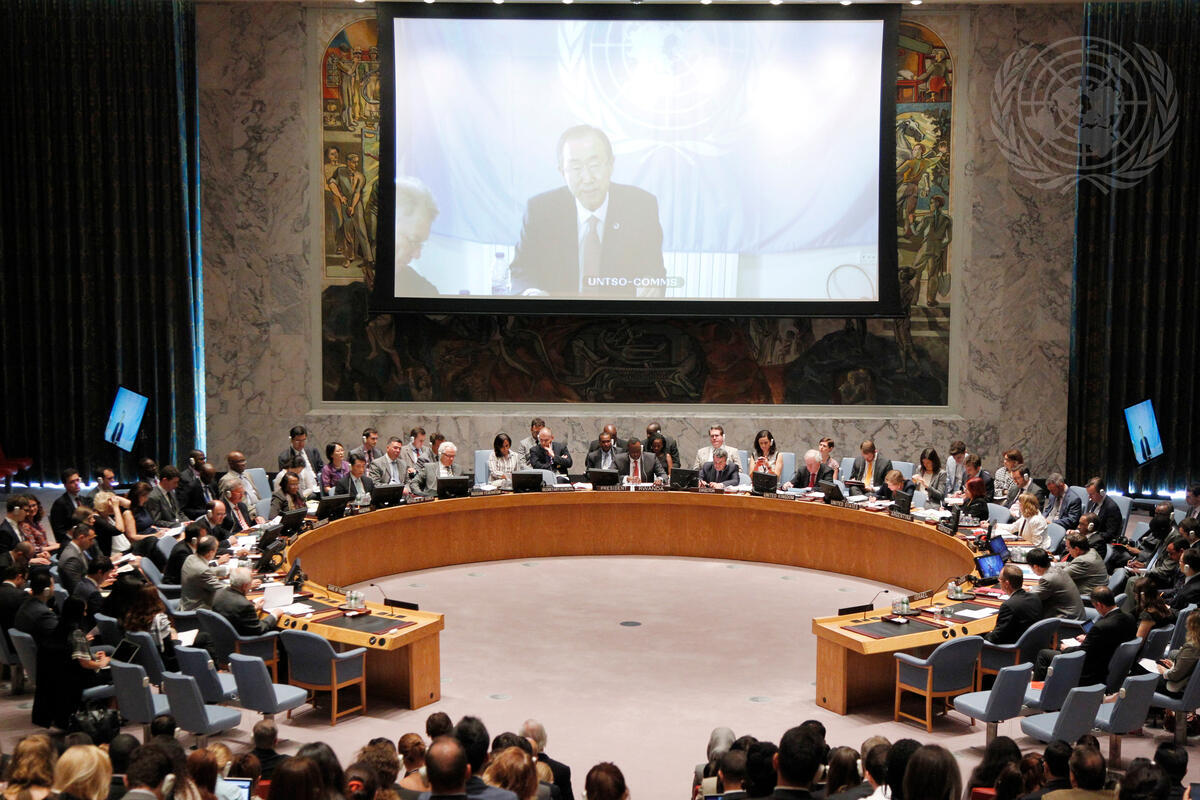 A wide view of today's Security Council meeting on the situation in the Middle East as Secretary-General Ban Ki-moon briefs members via videoconference from Ramallah.