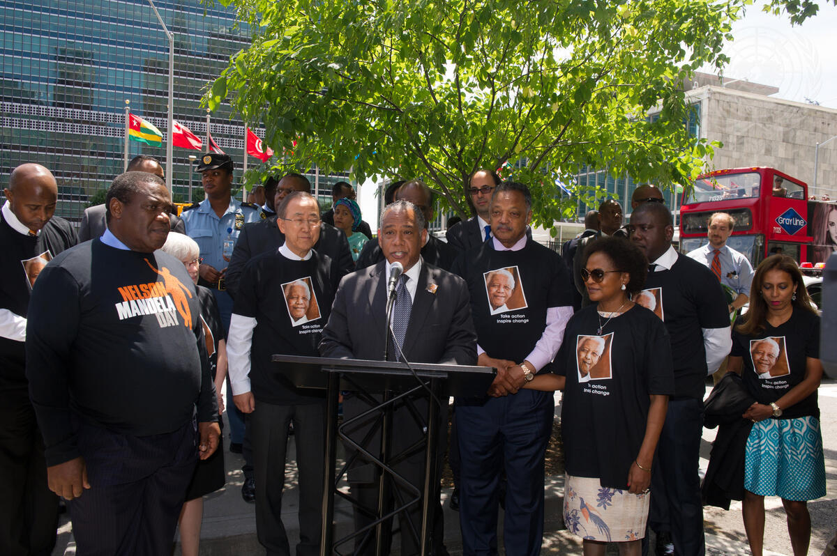 Mitchell J. Silver(at podium), FAICP, Commissioner, New York City Department of Parks and Recreation, speaks at today's event. To the left of Mr. Silver is Secretary-General Ban Ki-moon and Jeremiah Nyamane Kingsley Mamabolo, Permanent Representative of the Republic of South Africa to the UN (far left). To the right are Rev. Jesse L. Jackson Sr., Civil Rights and Anti-Apartheid Activist, and Baleka Mbete, Speaker of the National Assembly of South Africa.