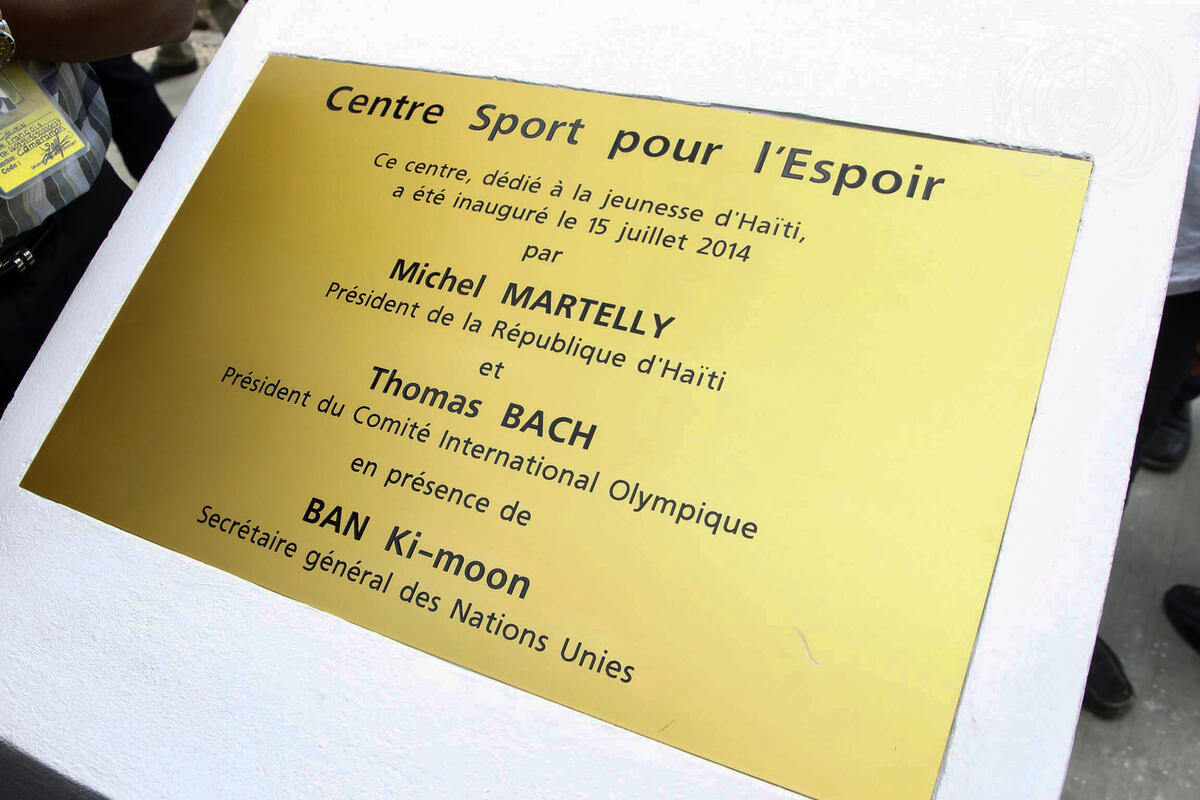 Inauguration plaque of the “Sports for Hope Centre”, indicating that the Centre was inaugurated on 15 July by Haitian President Martelly and IOC President Bach, in the presence of the Secretary-General.